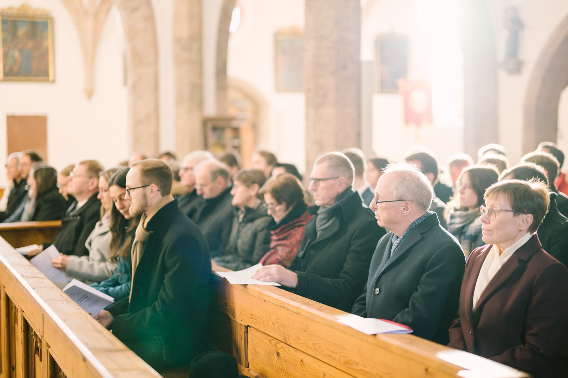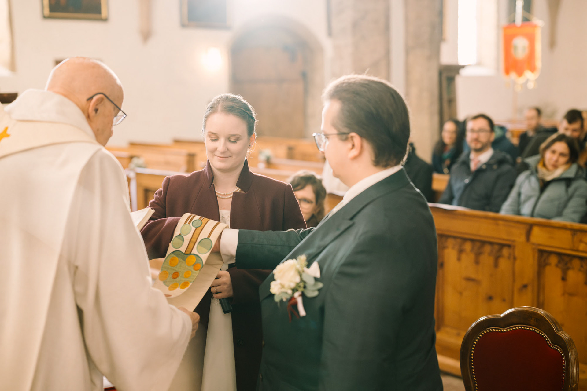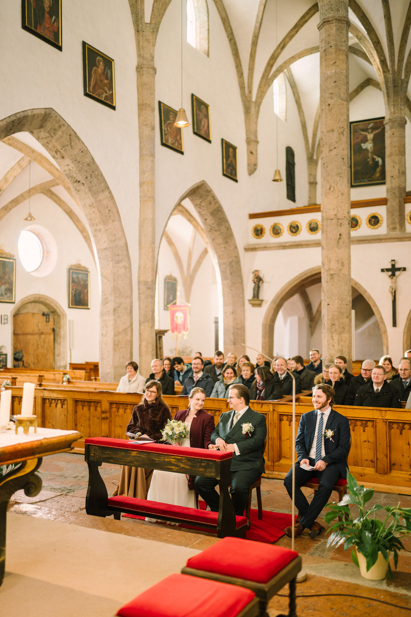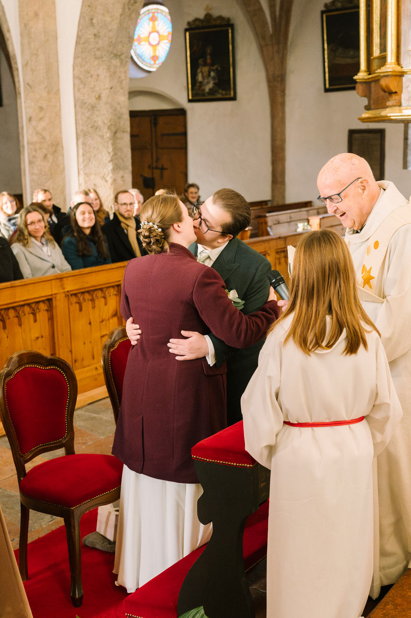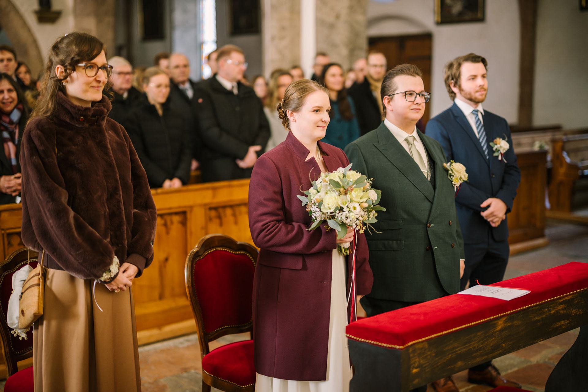 Vor der Trauung gab es noch ein paar Gruppenfotos und die Agape mit Glühwein und Keksen, während nach und nach alle Gäste eintrafen. Gemeinsam marschierten dann alle für die Trauung zur Kirche hinauf. Judith & Michael hatten dafür extra ihren eigenen Pfarrer anreisen lassen. Es war eine wunderschöne Trauung mit Messe inkludiert. Sogar die Sonne schien ab und zu durch die Fenster und erleuchtete unser Paar.