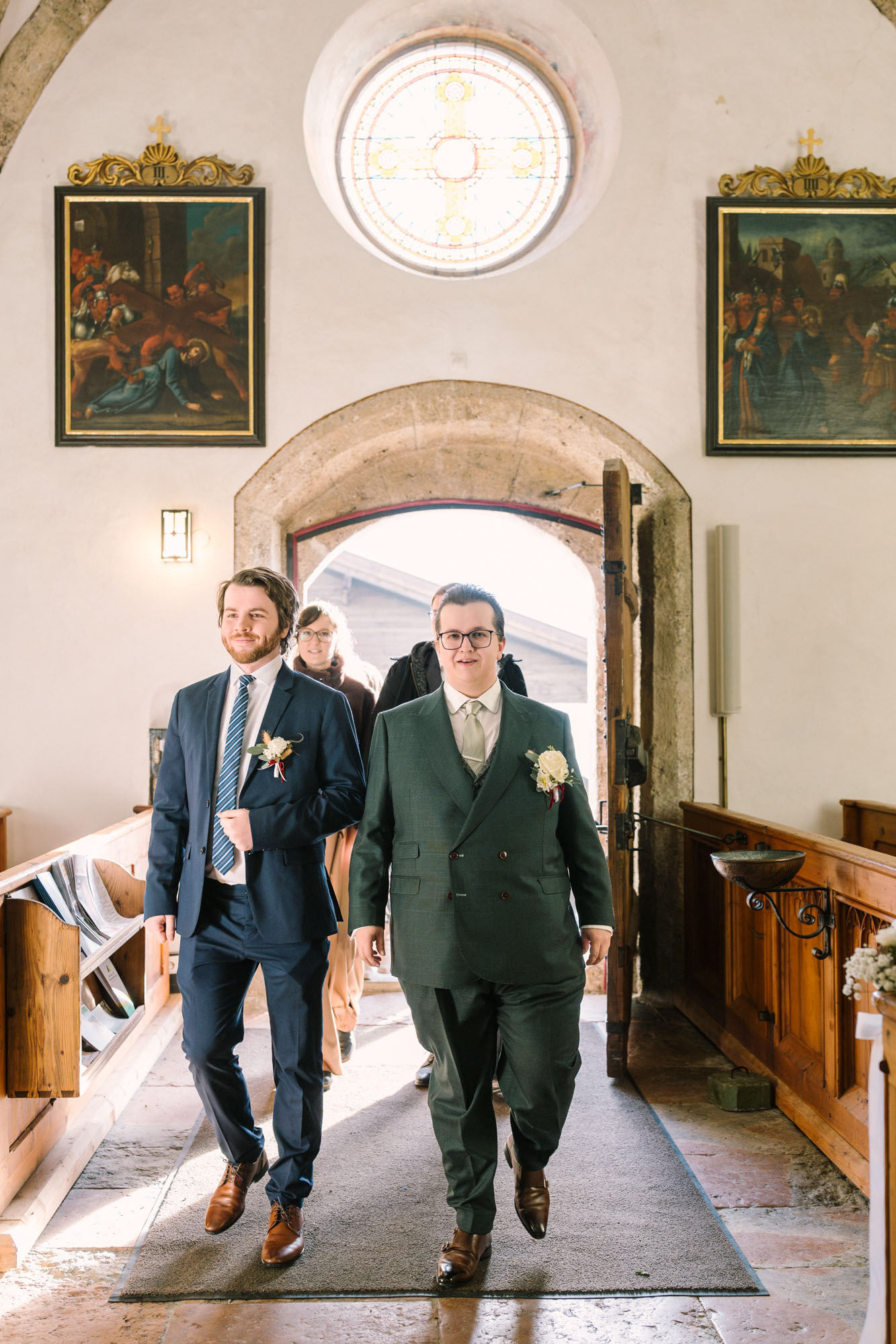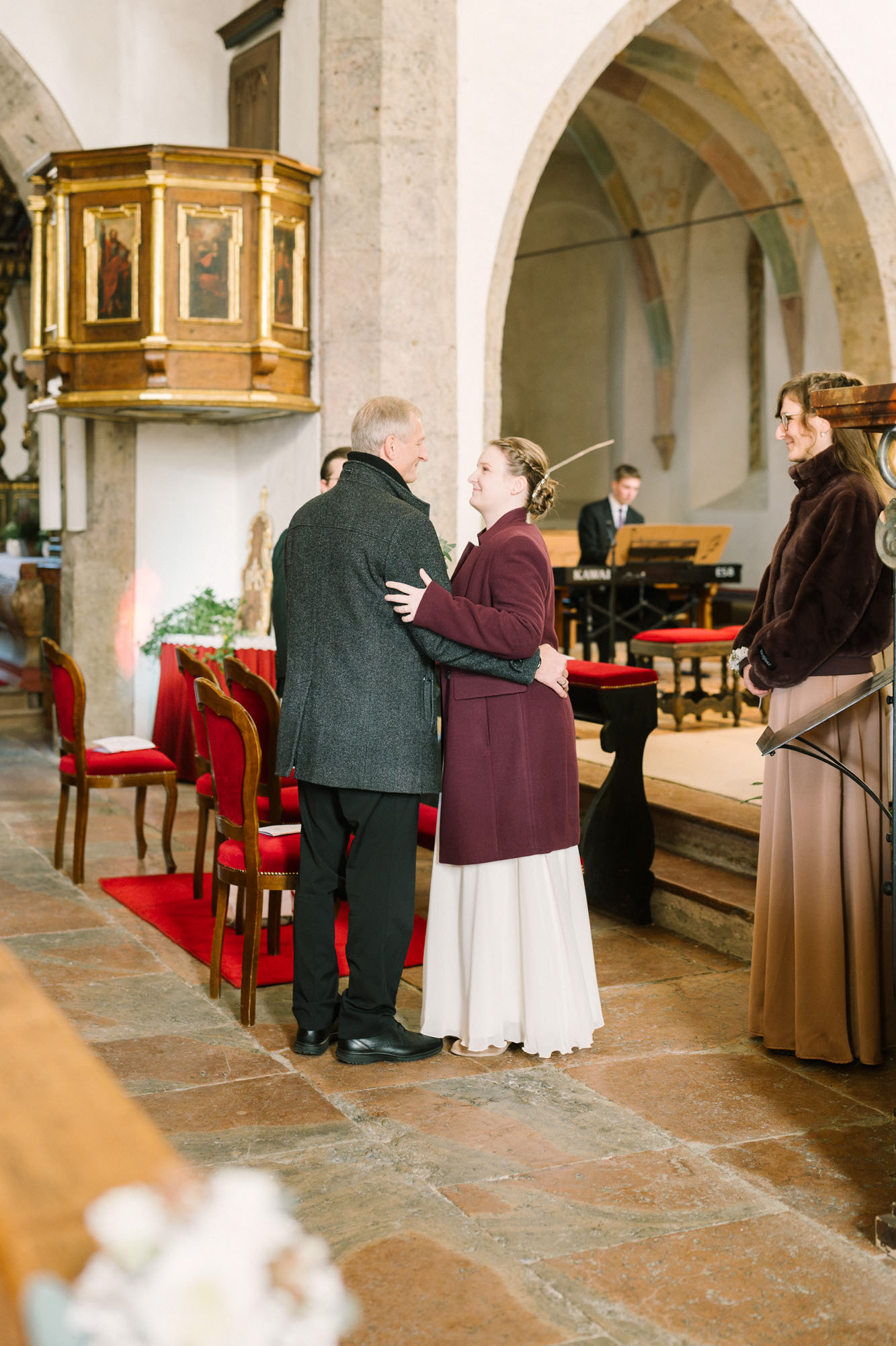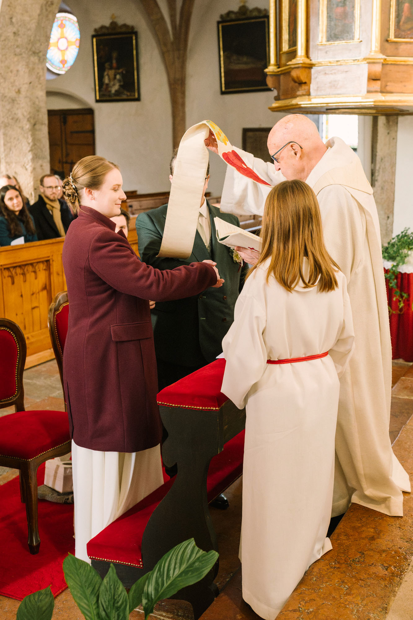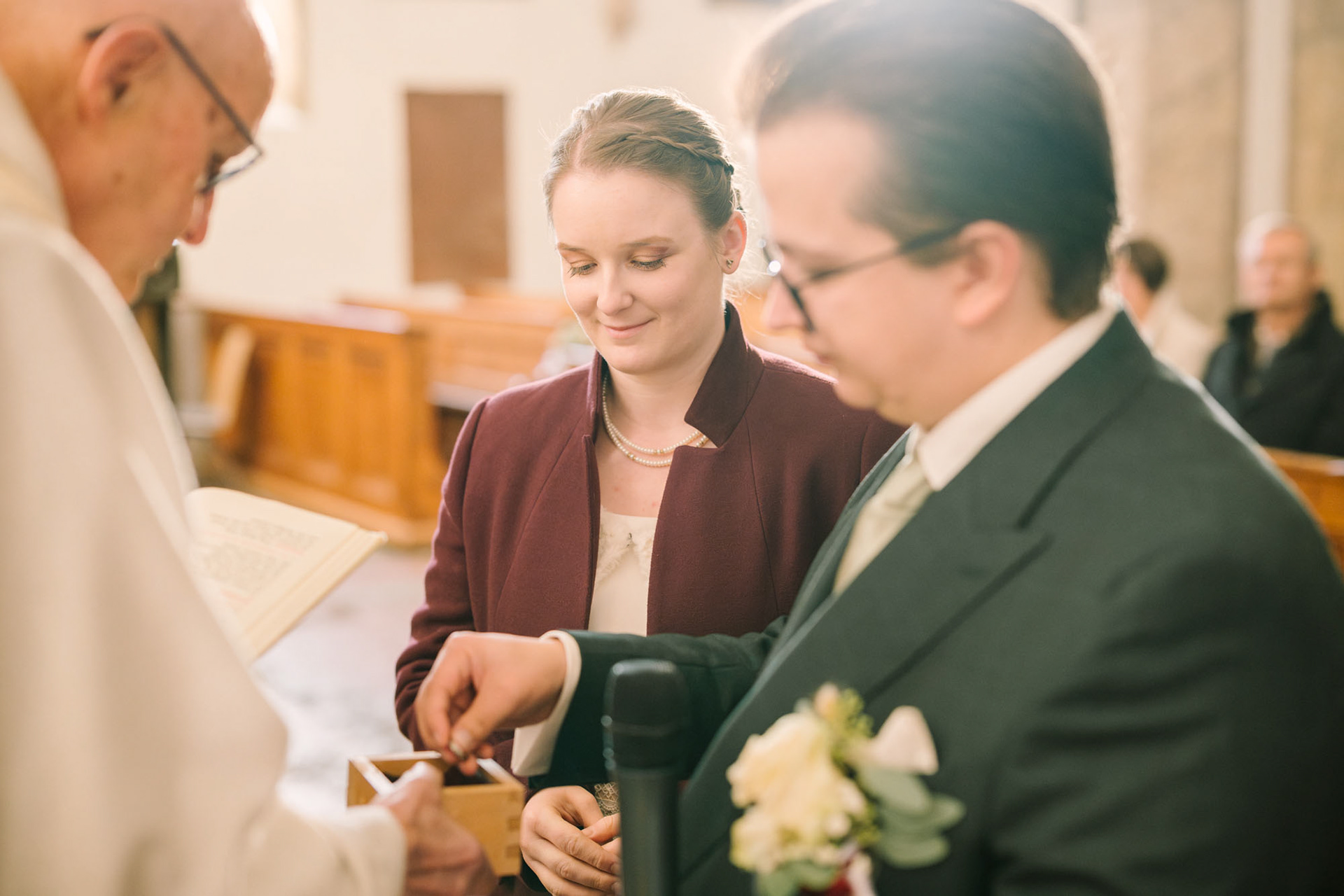 Vor der Trauung gab es noch ein paar Gruppenfotos und die Agape mit Glühwein und Keksen, während nach und nach alle Gäste eintrafen. Gemeinsam marschierten dann alle für die Trauung zur Kirche hinauf. Judith & Michael hatten dafür extra ihren eigenen Pfarrer anreisen lassen. Es war eine wunderschöne Trauung mit Messe inkludiert. Sogar die Sonne schien ab und zu durch die Fenster und erleuchtete unser Paar.