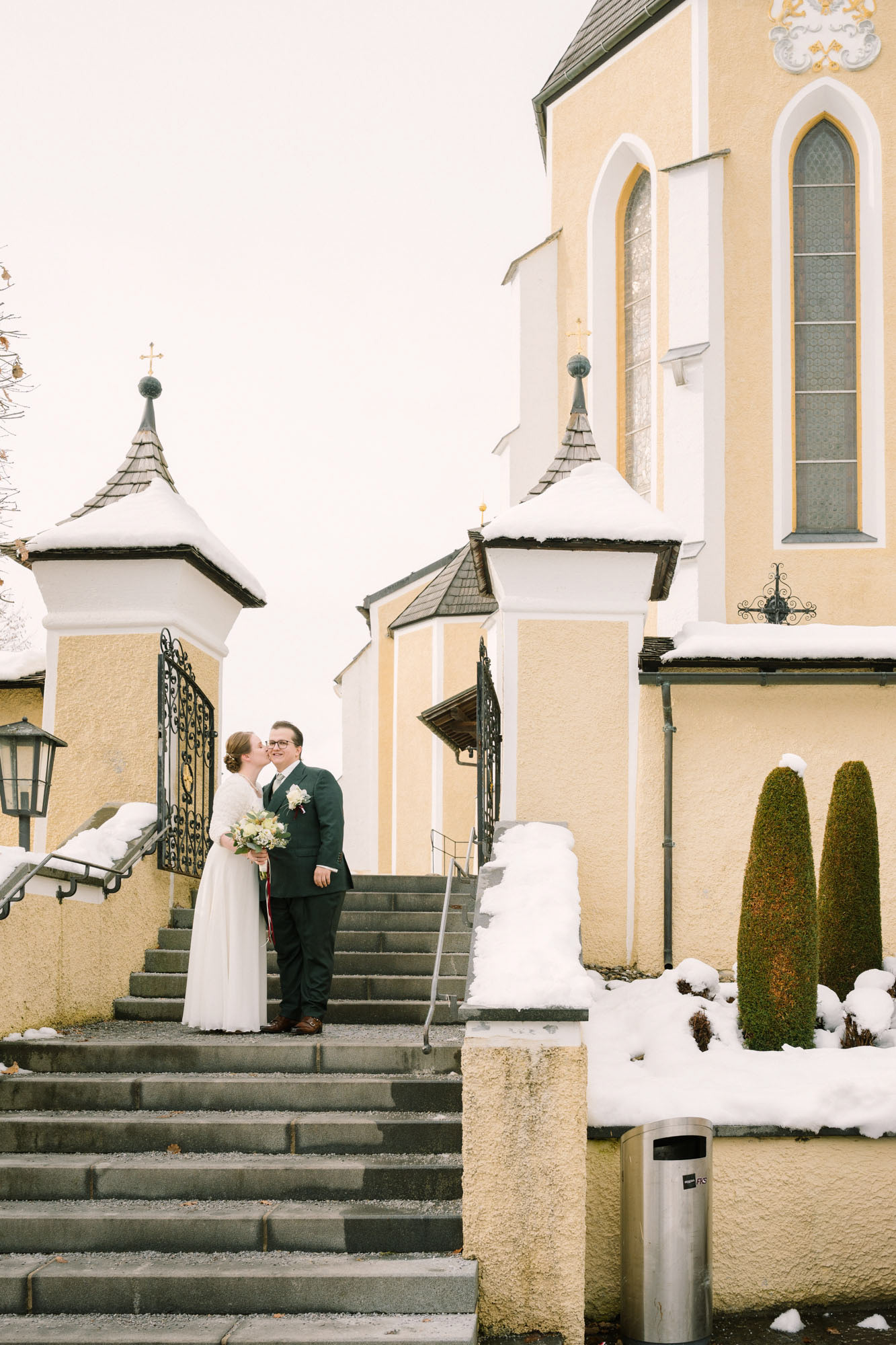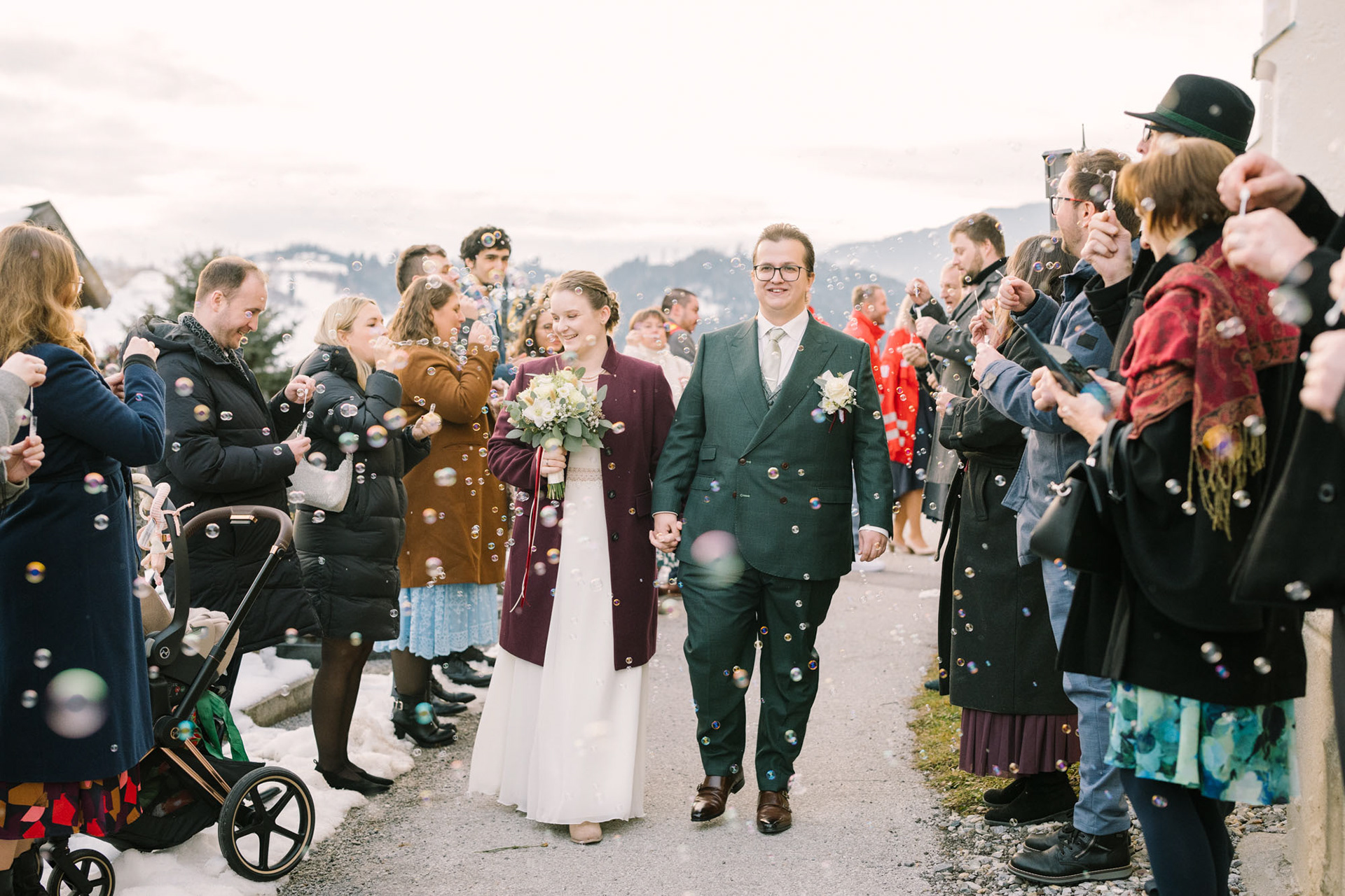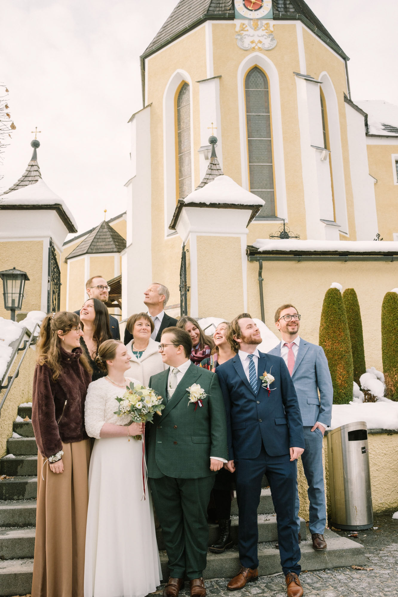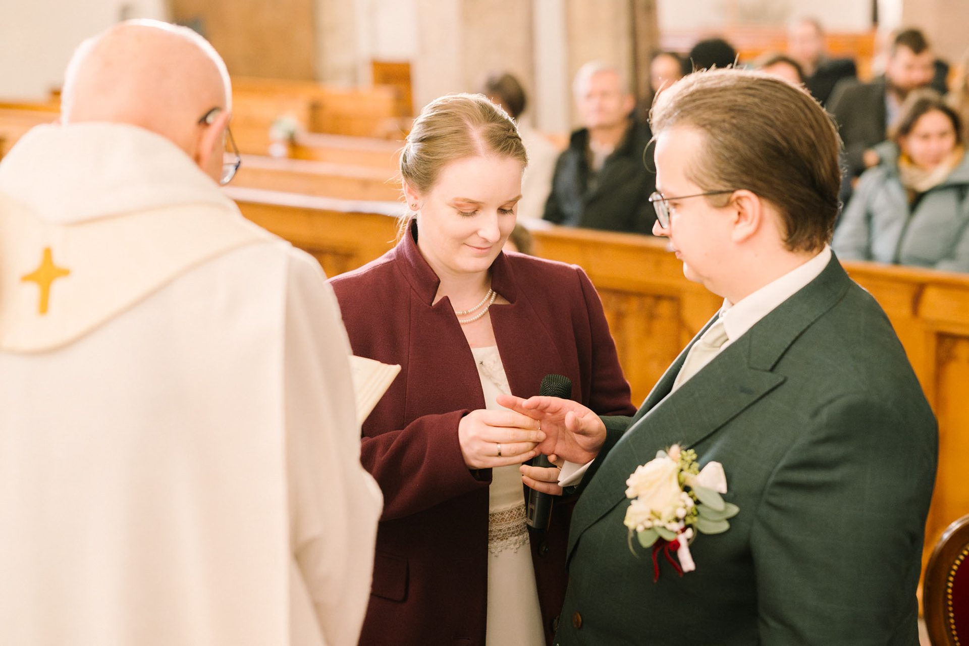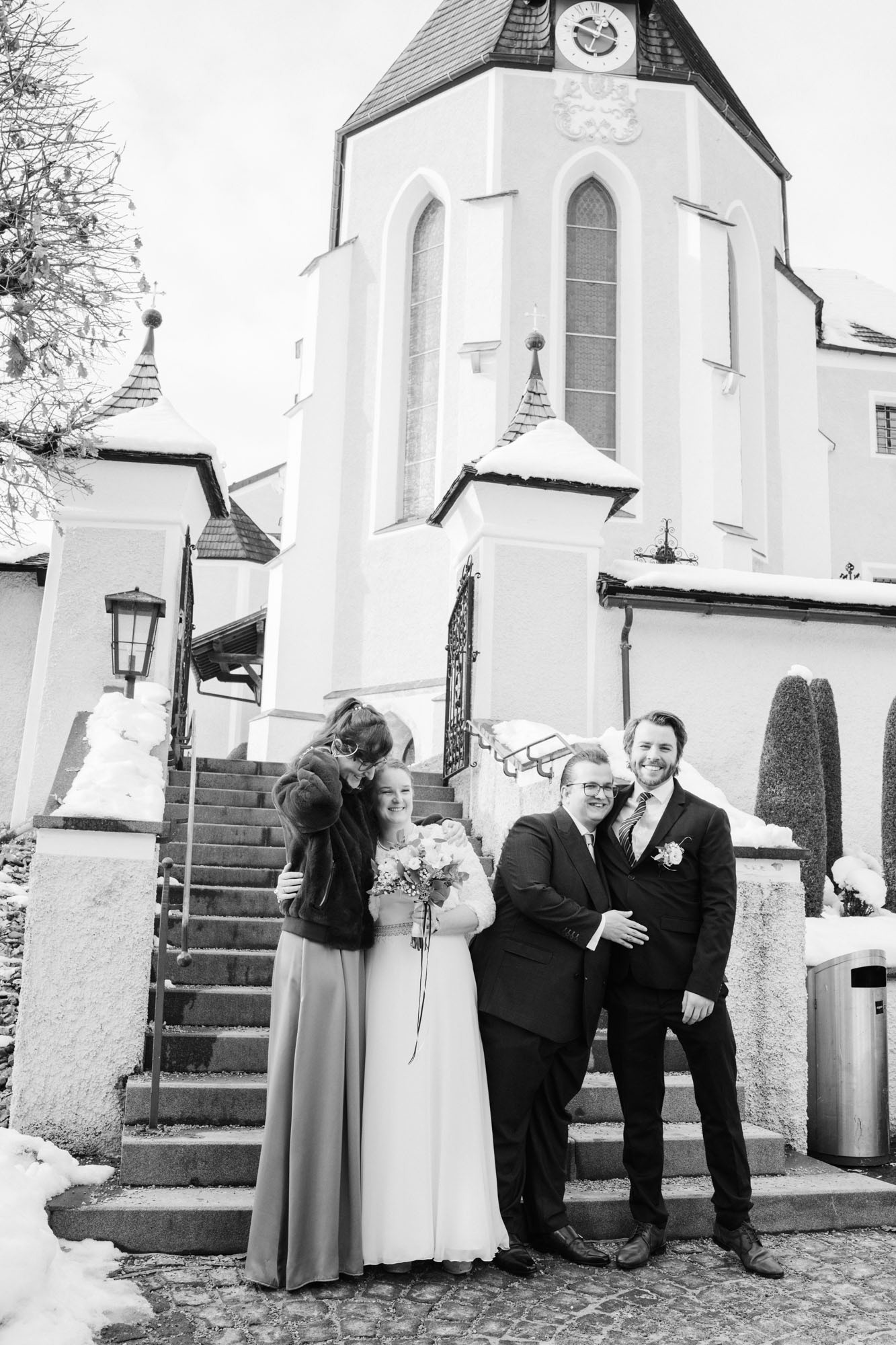 Vor der Trauung gab es noch ein paar Gruppenfotos und die Agape mit Glühwein und Keksen, während nach und nach alle Gäste eintrafen. Gemeinsam marschierten dann alle für die Trauung zur Kirche hinauf. Judith & Michael hatten dafür extra ihren eigenen Pfarrer anreisen lassen. Es war eine wunderschöne Trauung mit Messe inkludiert. Sogar die Sonne schien ab und zu durch die Fenster und erleuchtete unser Paar.