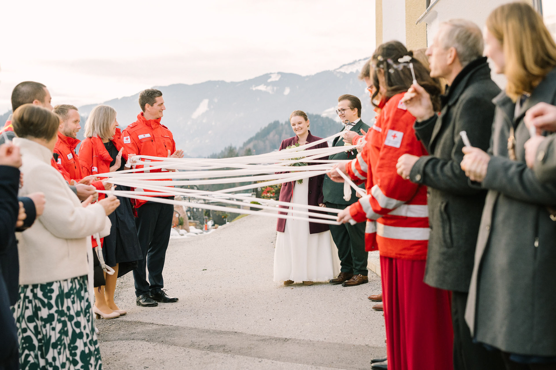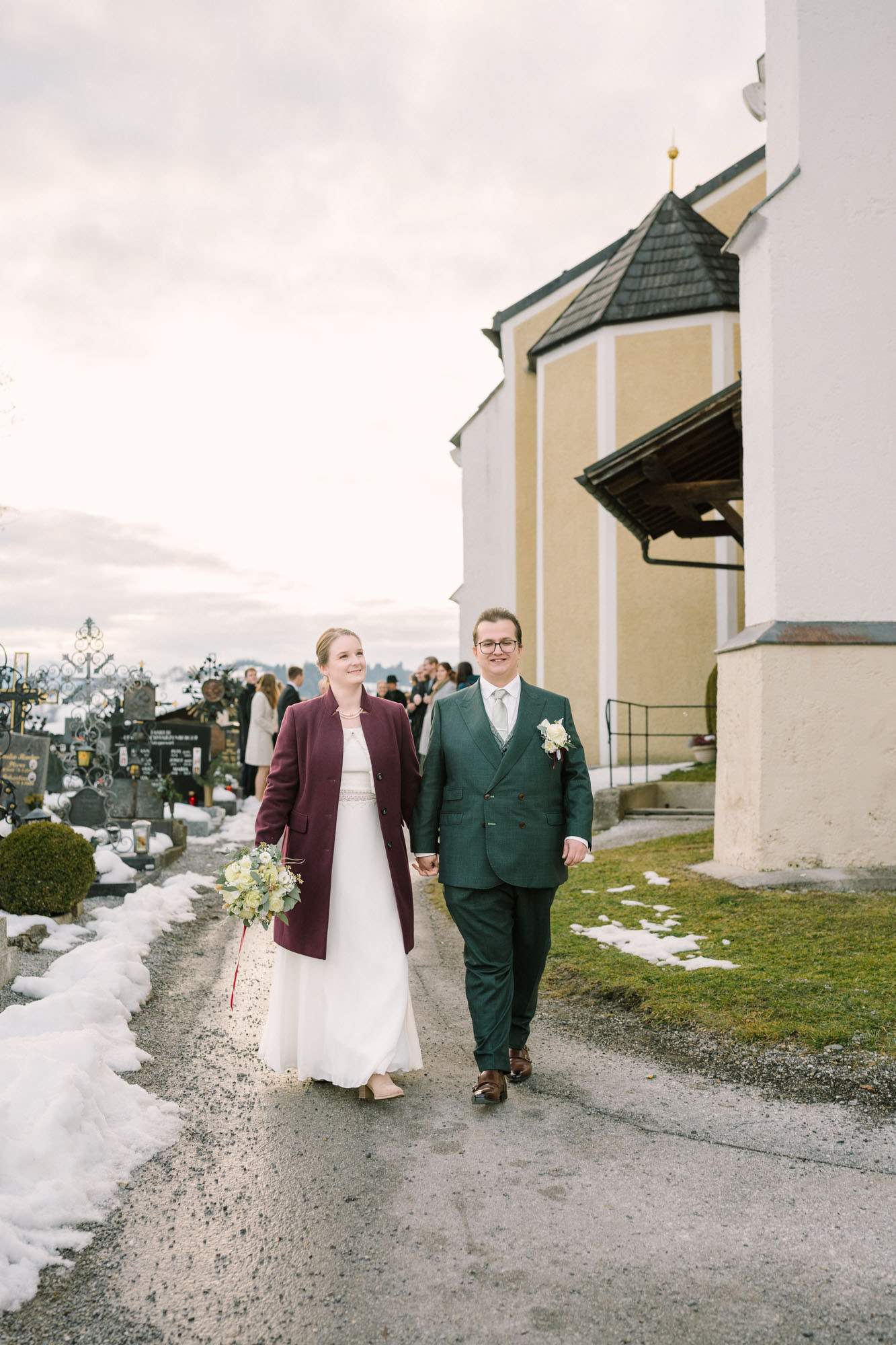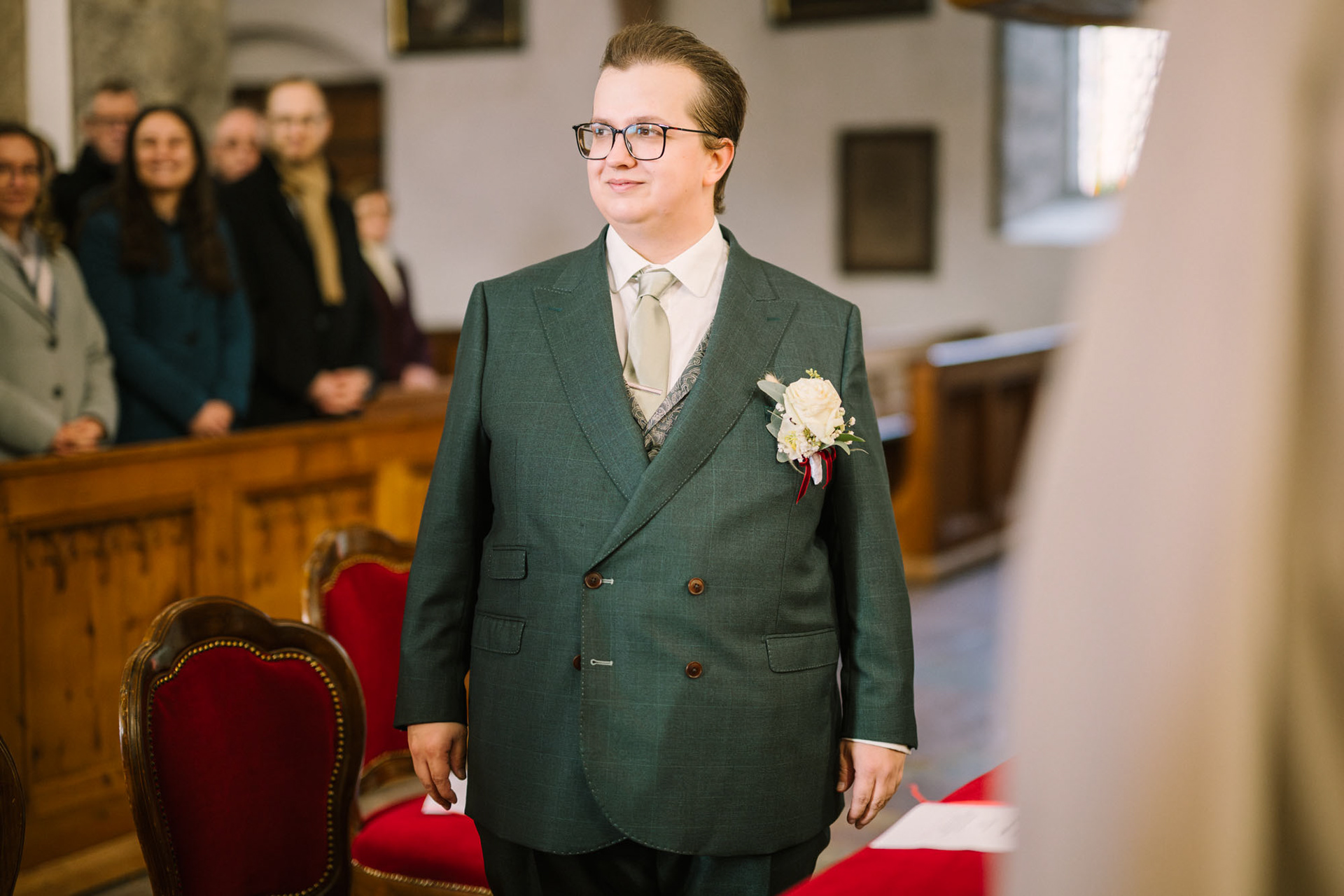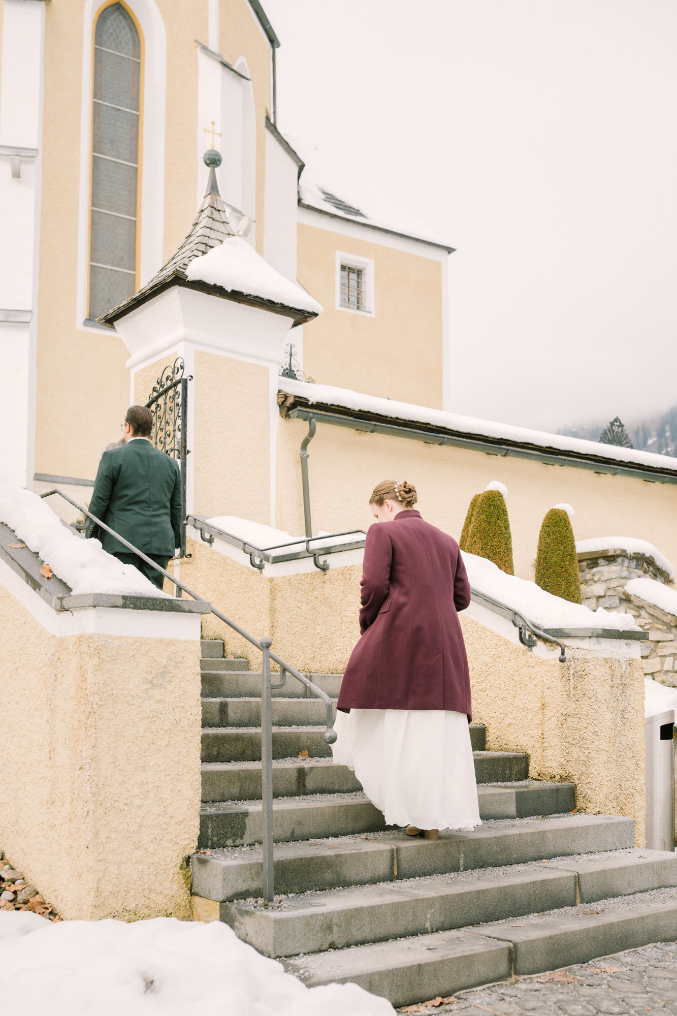 Vor der Trauung gab es noch ein paar Gruppenfotos und die Agape mit Glühwein und Keksen, während nach und nach alle Gäste eintrafen. Gemeinsam marschierten dann alle für die Trauung zur Kirche hinauf. Judith & Michael hatten dafür extra ihren eigenen Pfarrer anreisen lassen. Es war eine wunderschöne Trauung mit Messe inkludiert. Sogar die Sonne schien ab und zu durch die Fenster und erleuchtete unser Paar.