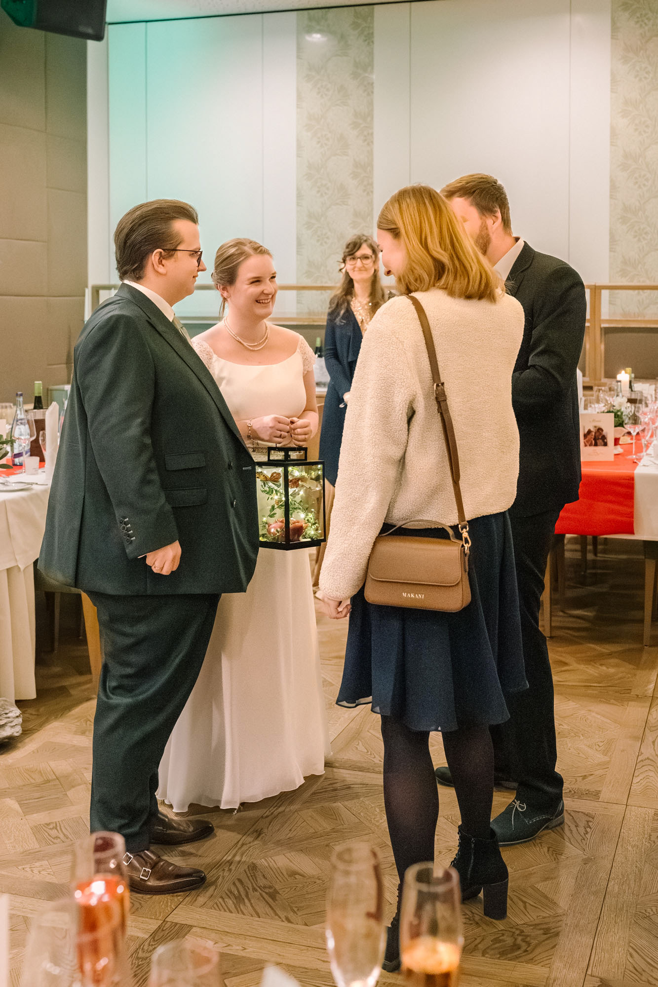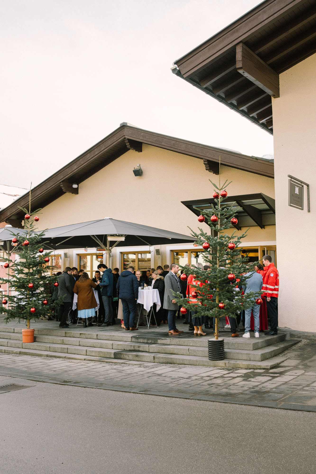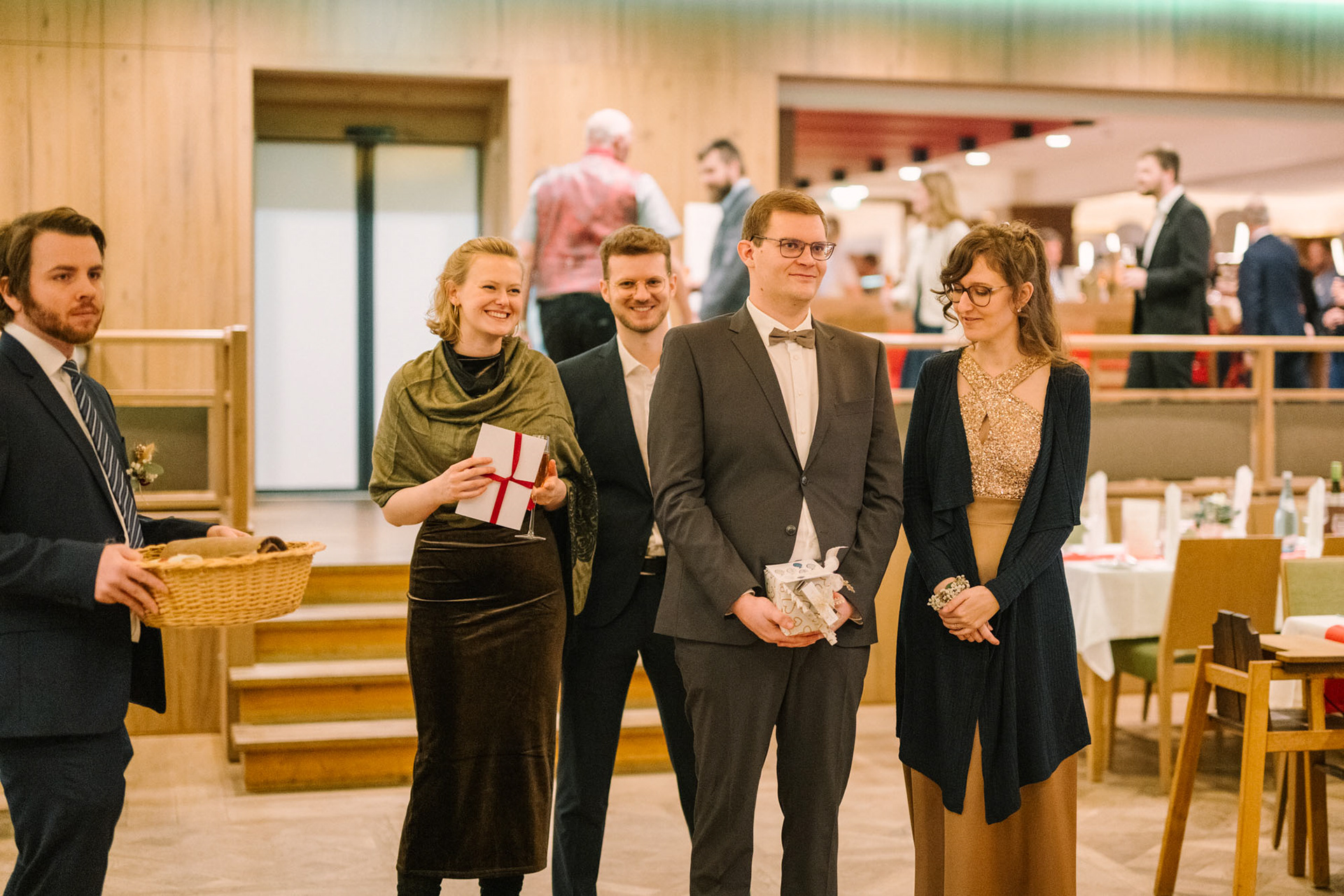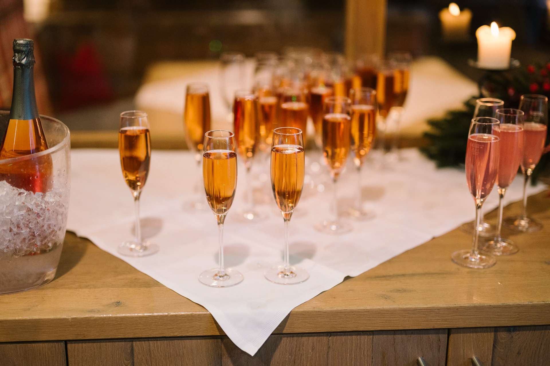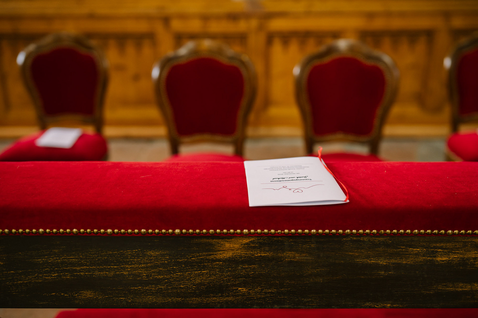 Vor der Trauung gab es noch ein paar Gruppenfotos und die Agape mit Glühwein und Keksen, während nach und nach alle Gäste eintrafen. Gemeinsam marschierten dann alle für die Trauung zur Kirche hinauf. Judith & Michael hatten dafür extra ihren eigenen Pfarrer anreisen lassen. Es war eine wunderschöne Trauung mit Messe inkludiert. Sogar die Sonne schien ab und zu durch die Fenster und erleuchtete unser Paar.
