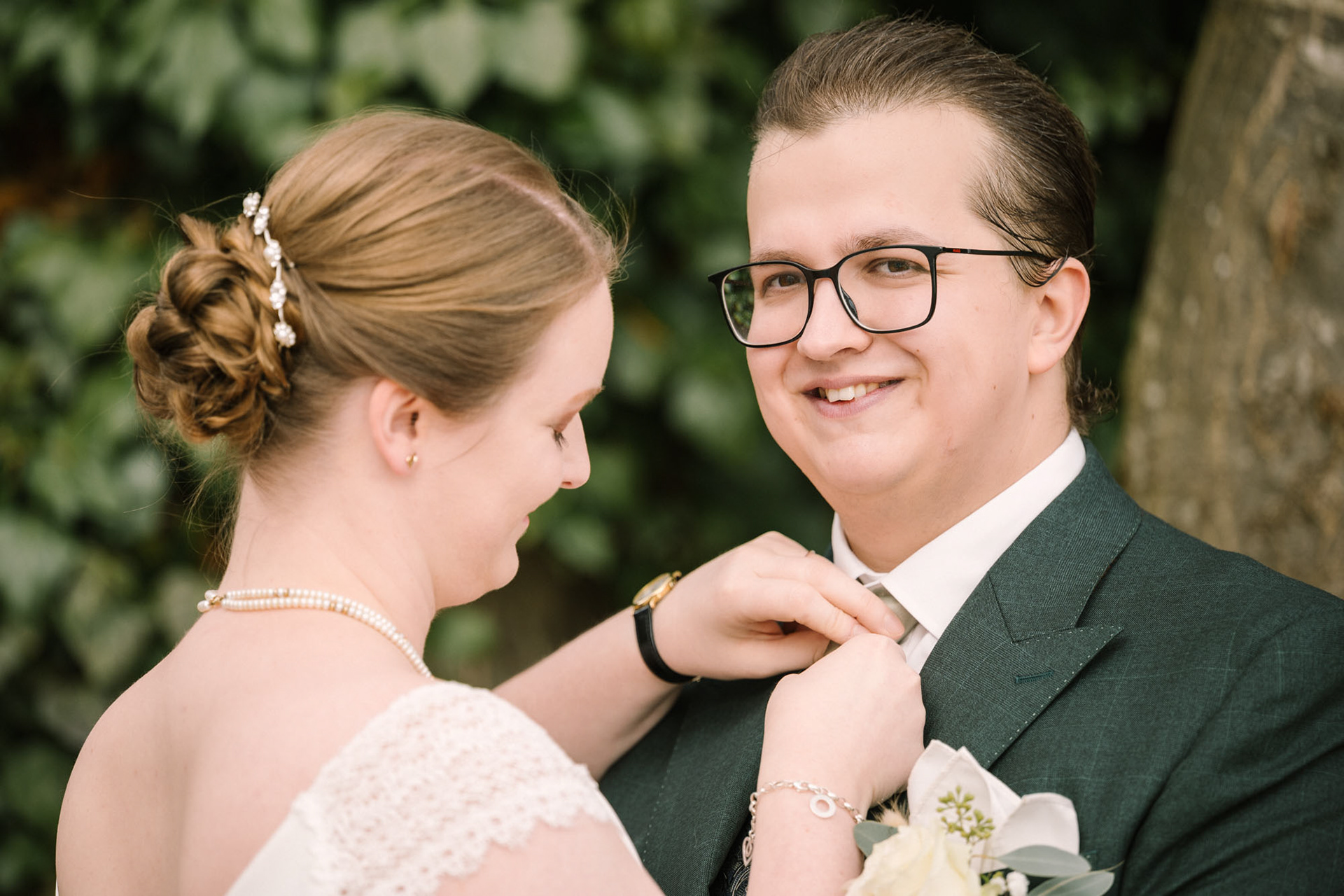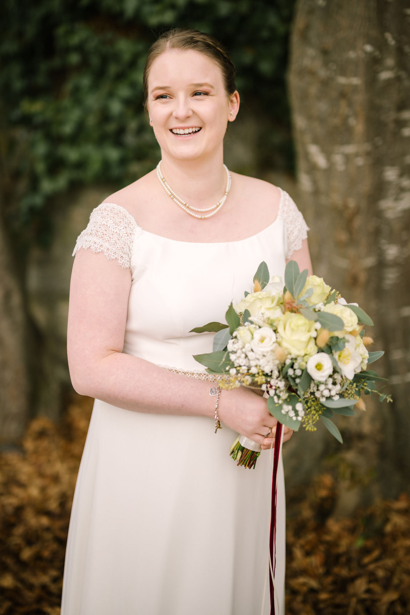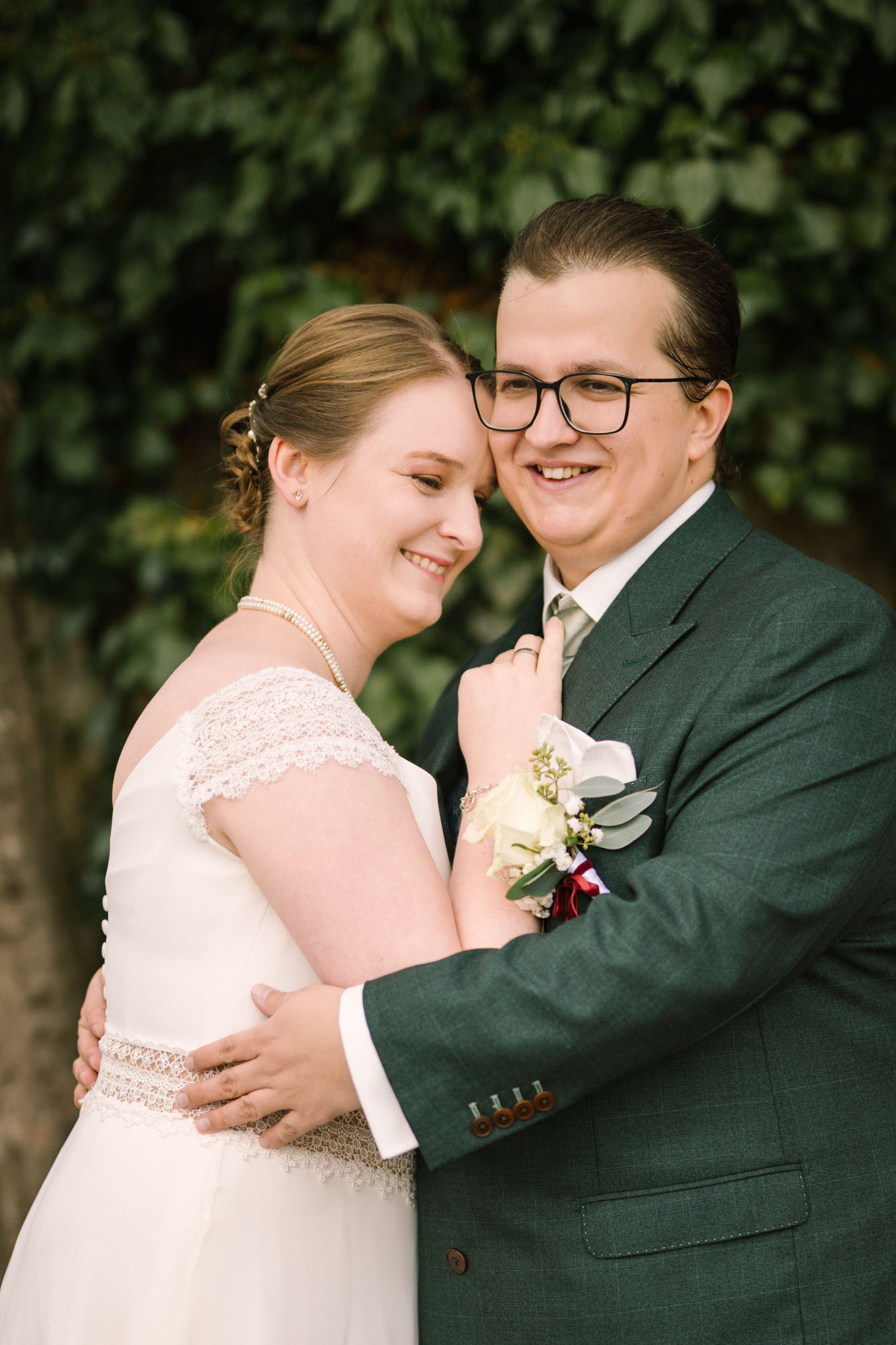Auch beim First-Look konnten Wir2 uns aufteilen. Thomas hat Michael zum Treffpunkt begleitet, wo er auf seine Judith wartete, die wiederum von Vera begleitet wurde. Nach dem glücklichen Zusammentreffen ging es weiter zum Paarshooting. Gleich neben der Kirche fanden wir dafür eine tolle Ecke mit noch herbstlichem Laub und grünen Bäumen im Hintergrund.