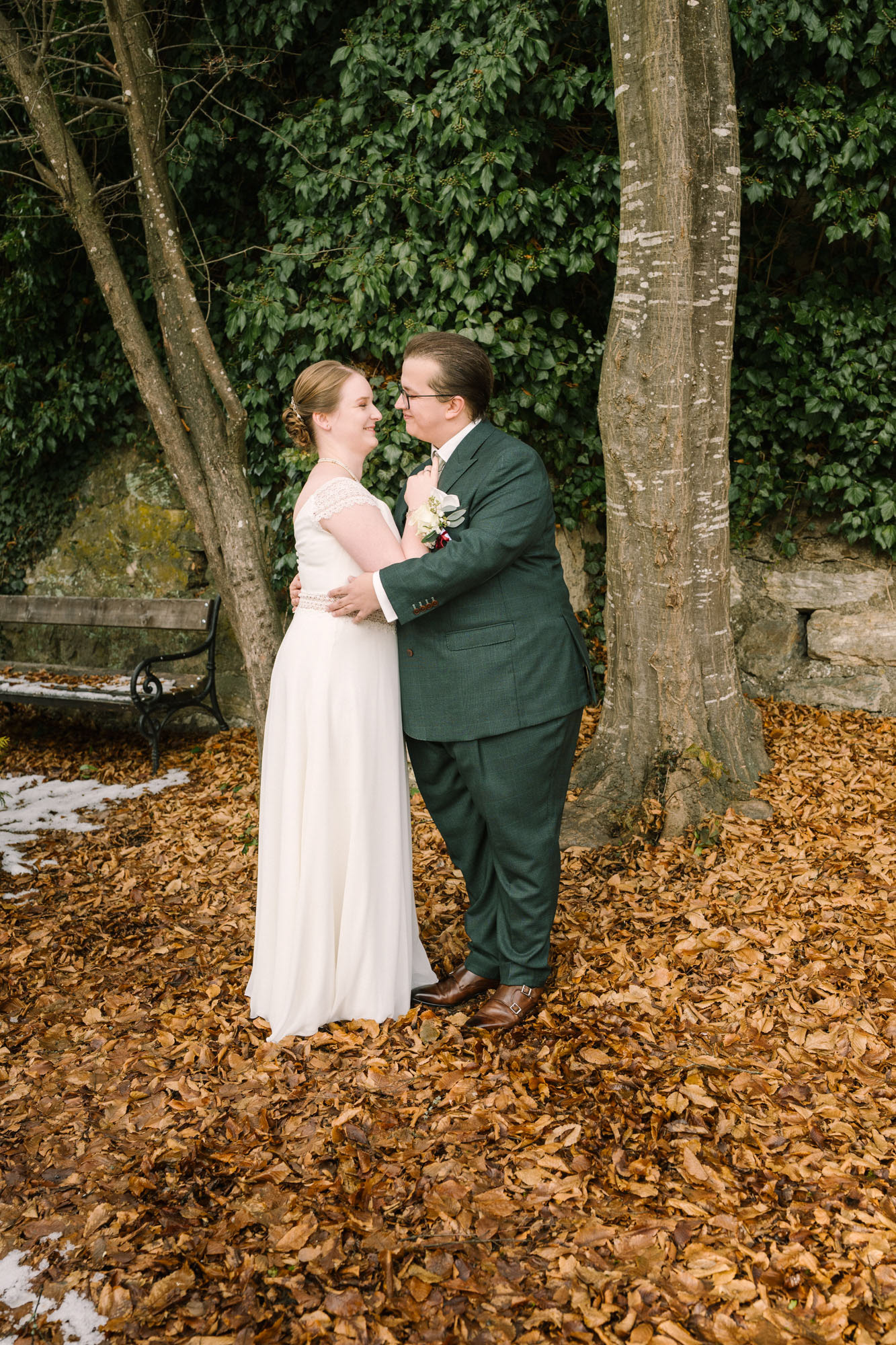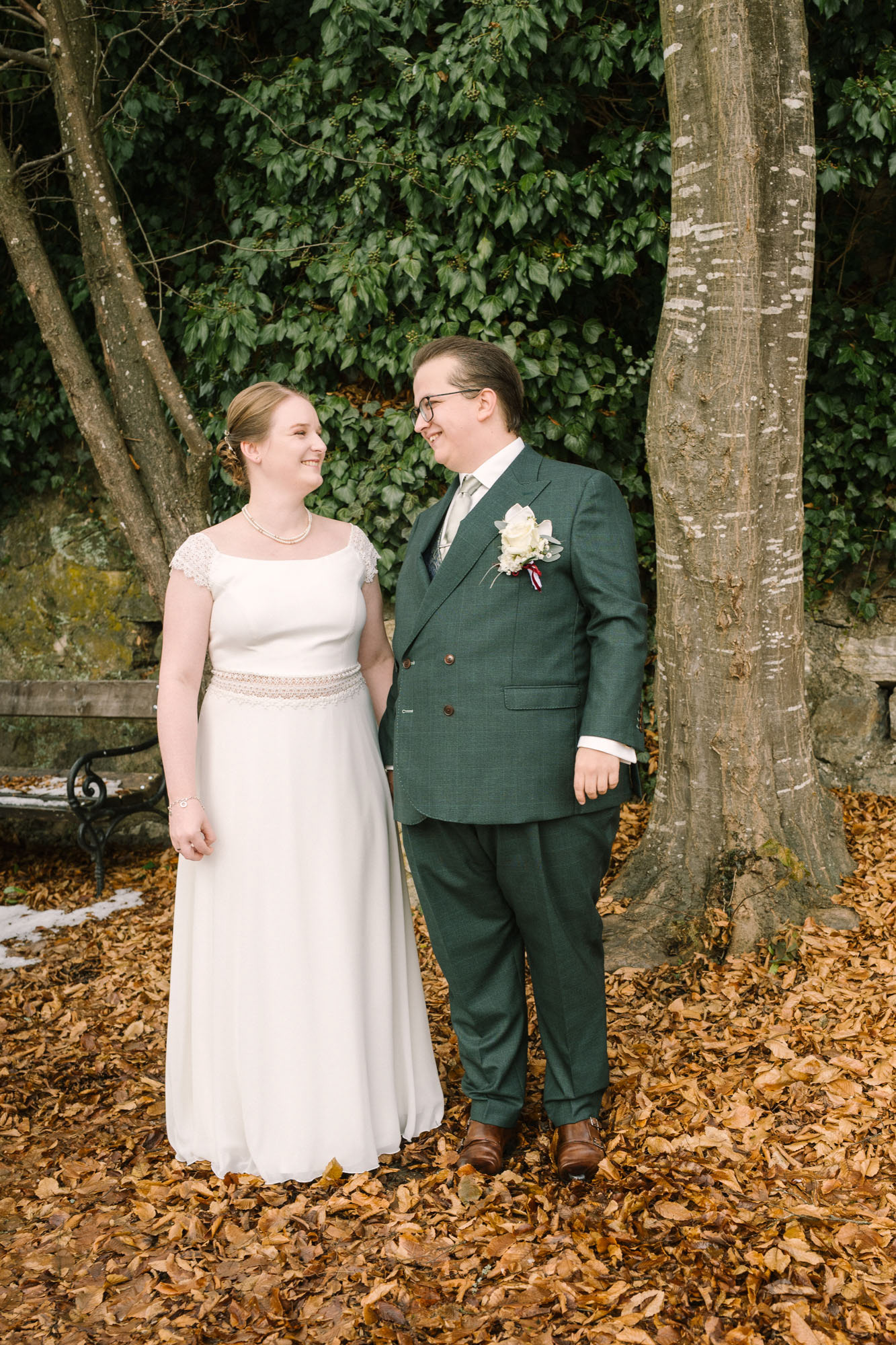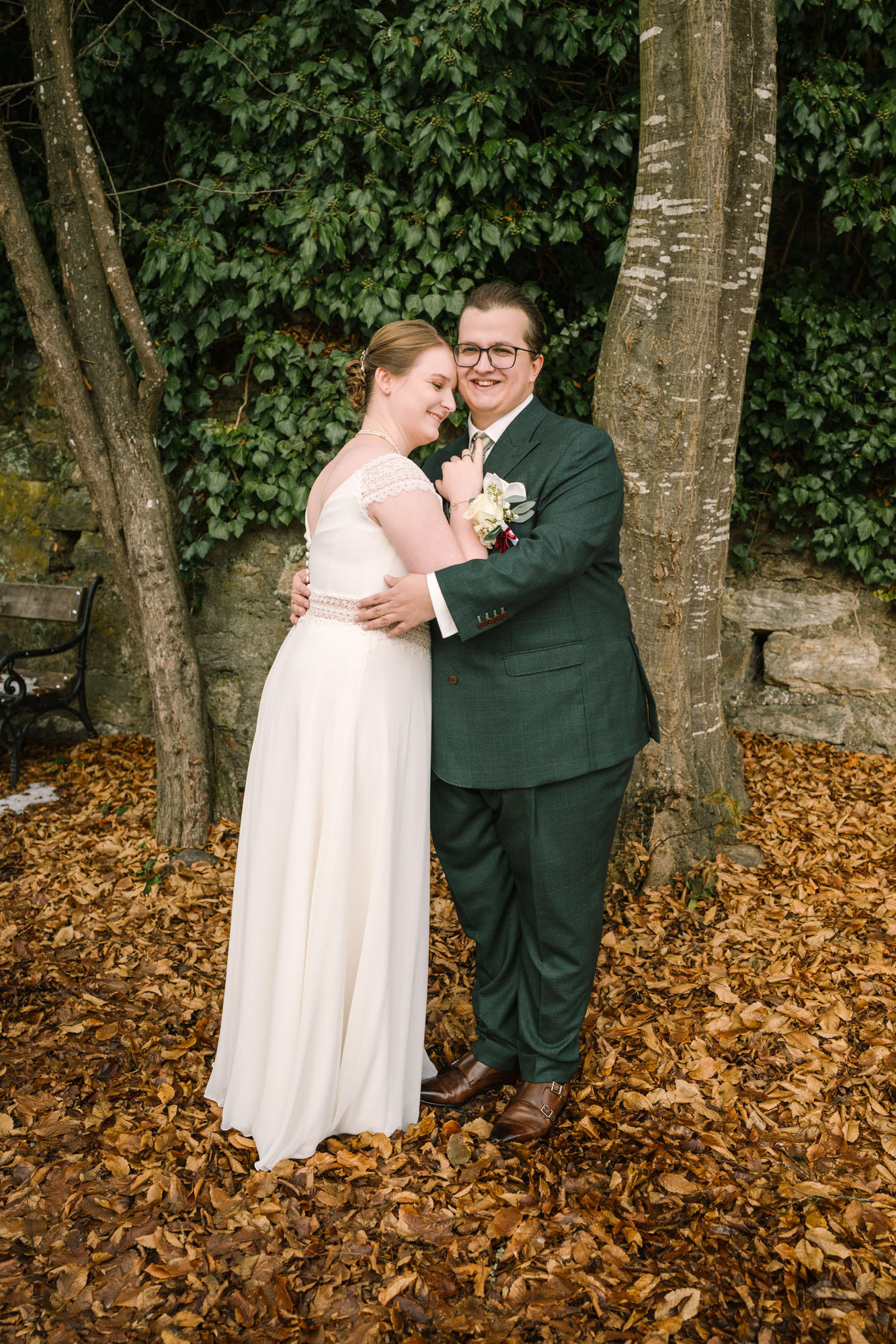 Auch beim First-Look konnten Wir2 uns aufteilen. Thomas hat Michael zum Treffpunkt begleitet, wo er auf seine Judith wartete, die wiederum von Vera begleitet wurde. Nach dem glücklichen Zusammentreffen ging es weiter zum Paarshooting. Gleich neben der Kirche fanden wir dafür eine tolle Ecke mit noch herbstlichem Laub und grünen Bäumen im Hintergrund.